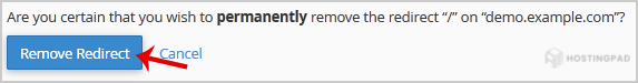 3. Scroll down to the end of the page and under Current Redirects locate the domain and click on the remove icon.