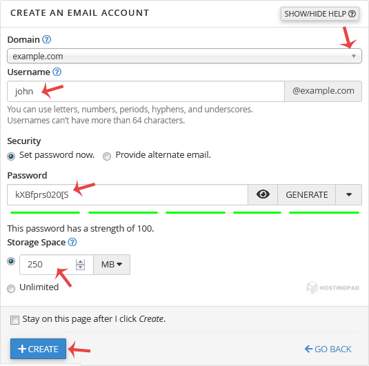 4. Under Create An Email Account, fill up the following details: