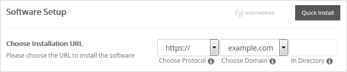- Choose Installation URL: Choose the appropriate protocol/domain. Inside the "In Directory" field, should you want to install this in a directory, i.e. example.com/directory, enter the directory name. Otherwise, leave it blank to install in your main domain, i.e. example.com