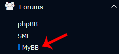 5. On the left side of your screen, you should locate the Forums category. Click on it and then click on the MyBB link that will appear.