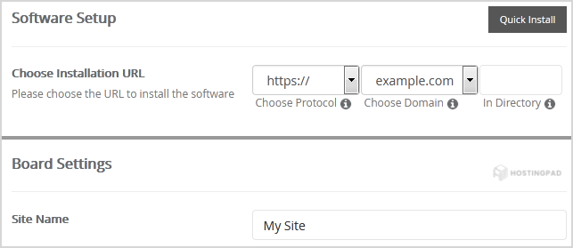 • Choose Installation URL: Choose the appropriate protocol/domain. Inside the "In Directory" field, should you want to install this in a directory, i.e., example.com/directory, enter the directory name. Otherwise, leave it blank to install in your main domain, i.e., example.com.