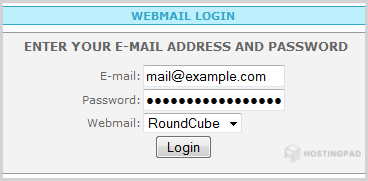 4. You will be redirected to a SiteWorx Webmail page. Enter your full e-mail address/password, choose RoundCube, Horde, or the SquirrelMail Webmail program in the Webmail field and then click on the login button.