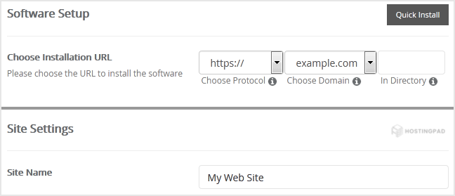 • Choose Installation URL: Choose the appropriate protocol/domain. Inside the "In Directory" field, should you want to install this in a directory, i.e. example.com/directory, enter the directory name. Otherwise, leave it blank to install in your main domain, i.e. example.com