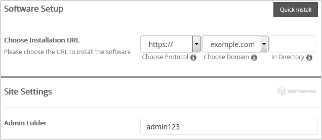 • Choose Installation URL: Choose the appropriate protocol/domain. Inside the "In Directory" field, should you want to install this in a directory, i.e., example.com/directory, enter the directory name. Otherwise, leave it blank to install in your main domain, i.e., example.com